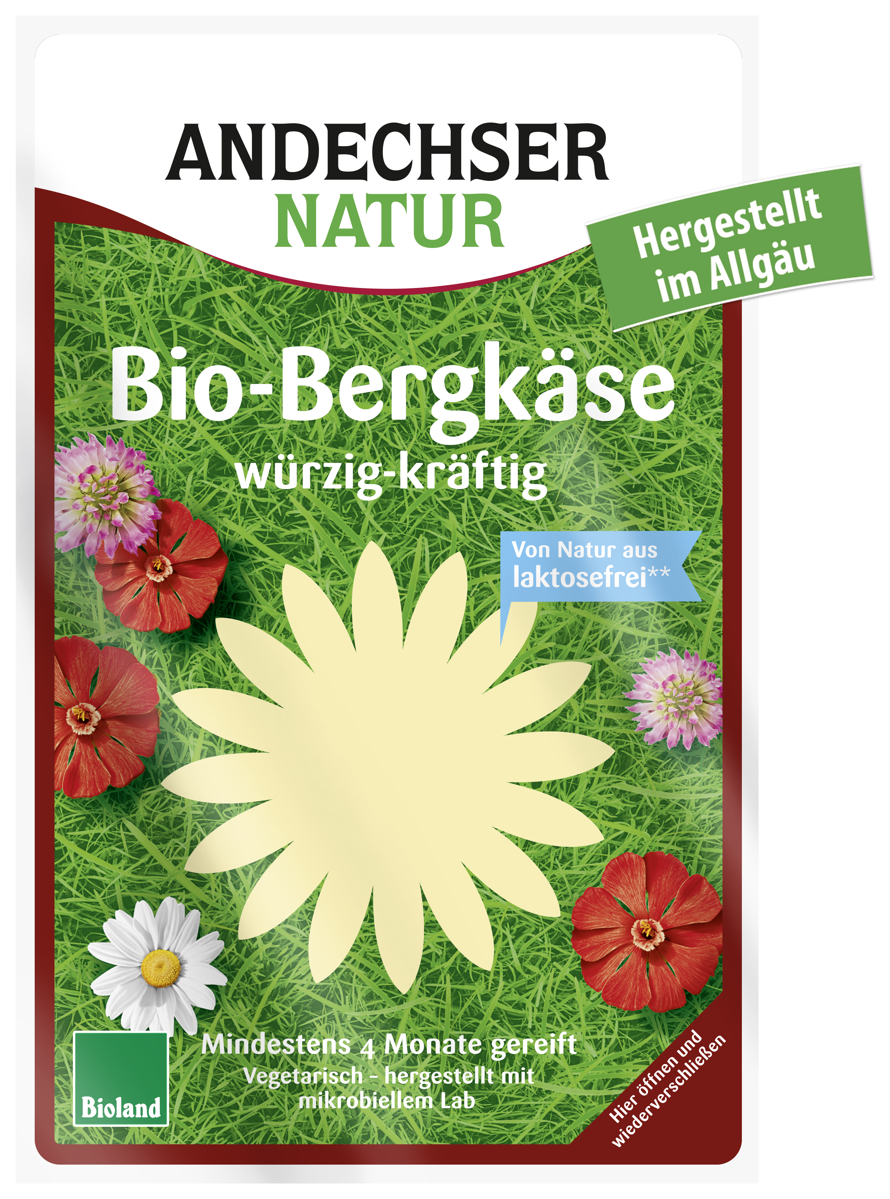 Der ANDECHSER NATUR Bio-Bergkäse mit 50% Fett weist durch die mindestens viermonatige Reifezeit ein besonders würzig-kräftiges Aroma auf und ist von Natur aus laktosefrei.