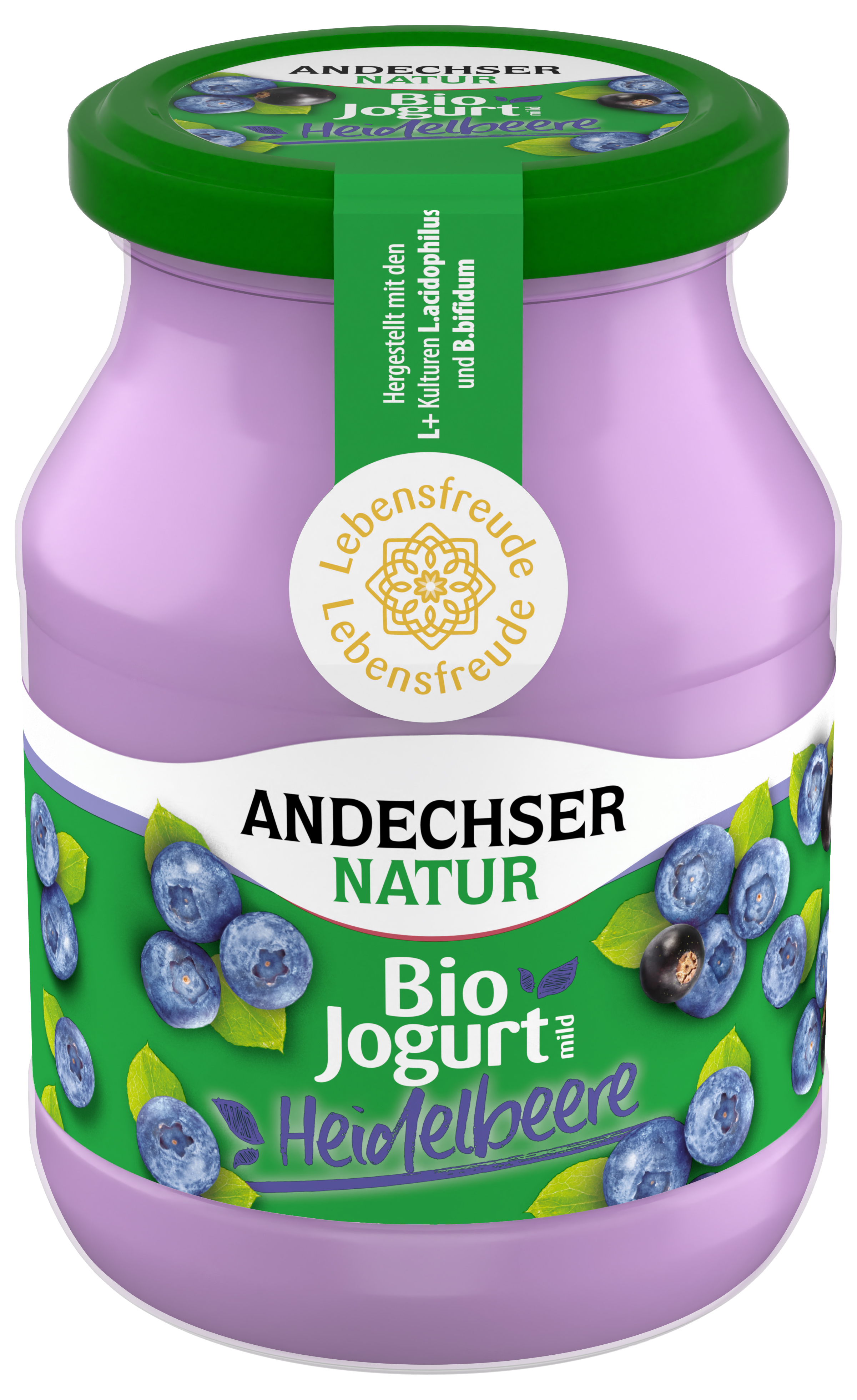 Fein säuerliche schwarze Johannisbeere und beliebte Heidelbeere vereinen sich mit wertvollem Naturjogurt: Das Ergebnis der fruchtig-frische ANDECHSER NATUR Bio-Jogurt mild Heidelbeere-Cassis mit 3,8% Fett im 500 g Mehrwegglas.