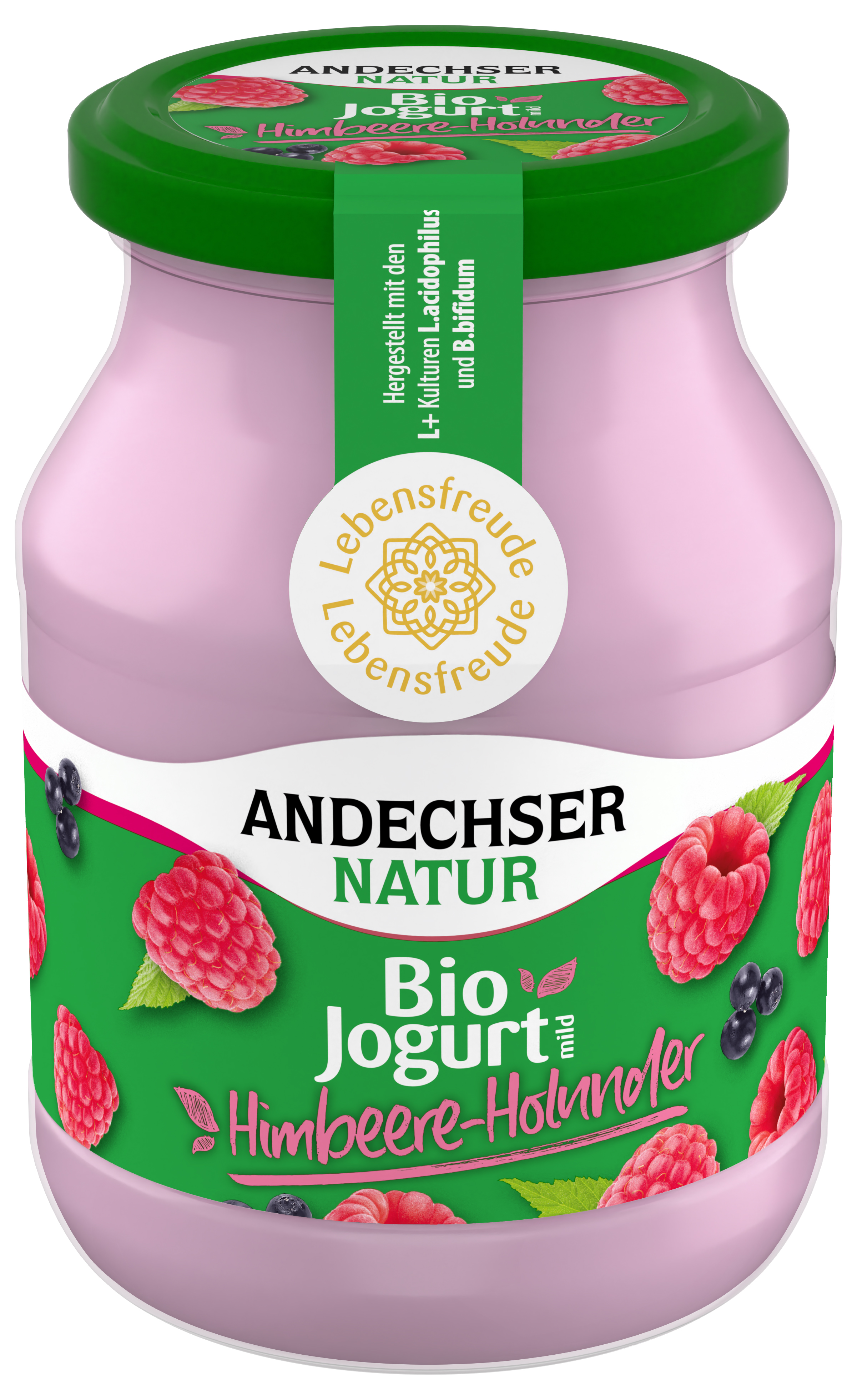 Der ANDECHSER NATUR Bio-Jogurt mild Himbeere-Holunder mit 3,8% Fett im 500g Mehrwegglas ist die fruchtig-natürliche Kombination bester Bio-Zutaten mit mildem fein-säuerlichen Bioland-Jogurt. Ohne Aromazusatz. Rückverfolgbar auf www.andechser-natur.de