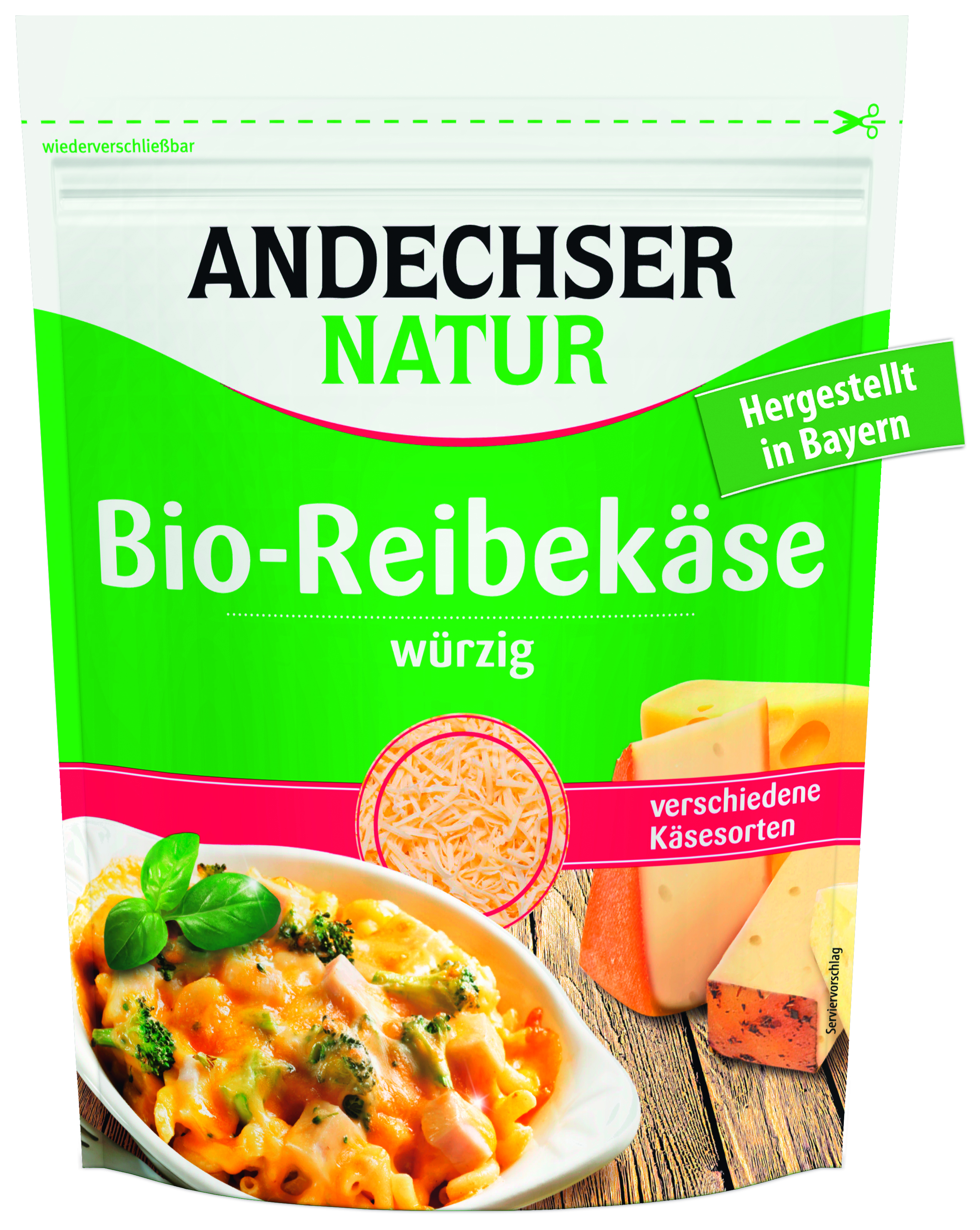 Der ANDECHSER NATUR Bio-Reibekäse ist ideal zum Gratinieren Ihrer Gerichte und zur unkomplizierten Verwendung bei Käsespätzle . Eine Auswahl von würzigen Bio-Käsespezialitäten mit 45% Fett i.t Tr., griffig gerieben und sehr gut streufähig.
