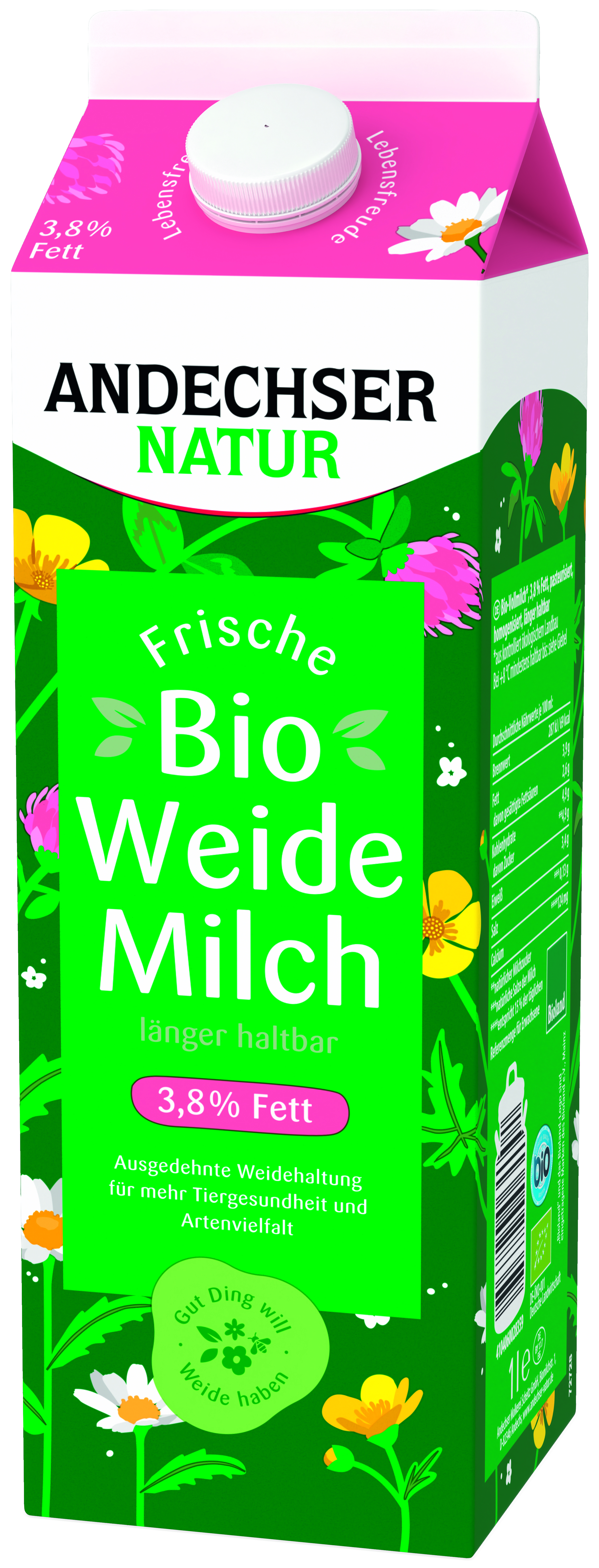 Die ANDECHSER NATUR Bio-Weidemilch mit 3,8% Fett mit vollmundigem Geschmack in Bioland-Qualität. Ausgedehnte Weidehaltung für mehr Tiergesundheit und Artenvielfalt. Rückverfolgbar bis zum Bio-Bauern auf www.andechser-natur.de