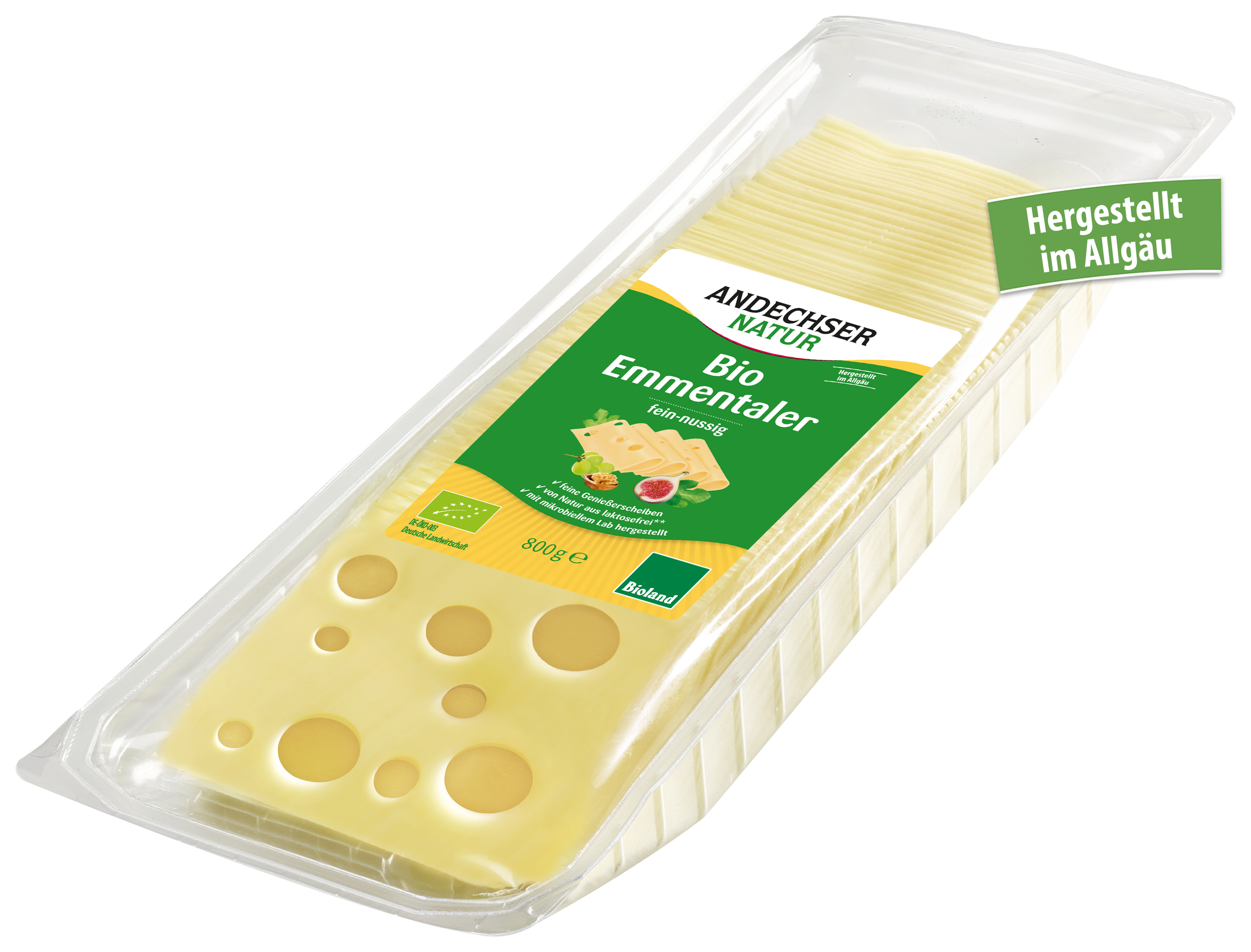 The ANDECHSER NATUR Organic Emmental cheese with 45% fat is made from the best organic milk. With its pleasantly mild note and slightly sour taste, this large-hole cheese is a favorite.