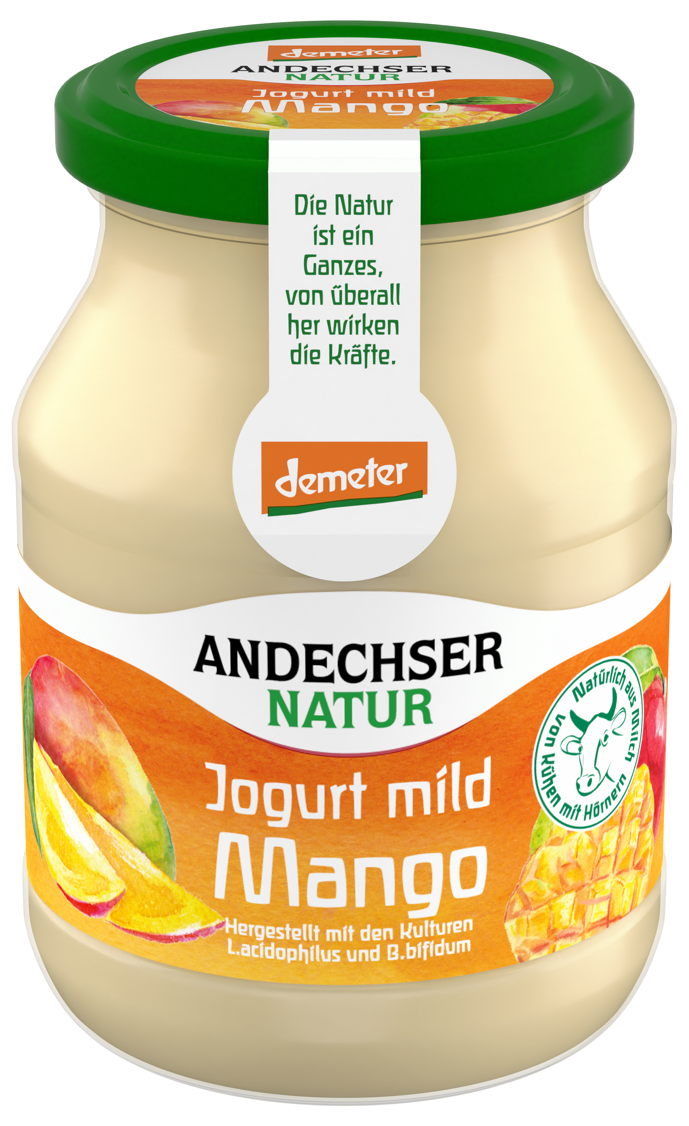 The ANDECHSER NATUR mild Demeter yogurt mango with 3.8 % fat in a returnable jar enthralls with its high content of fruits and its creamy texture. Pure, genuine and natural taste. Without flavor additives. Traceabilty to the organic farmer at www.andechser-natur.de