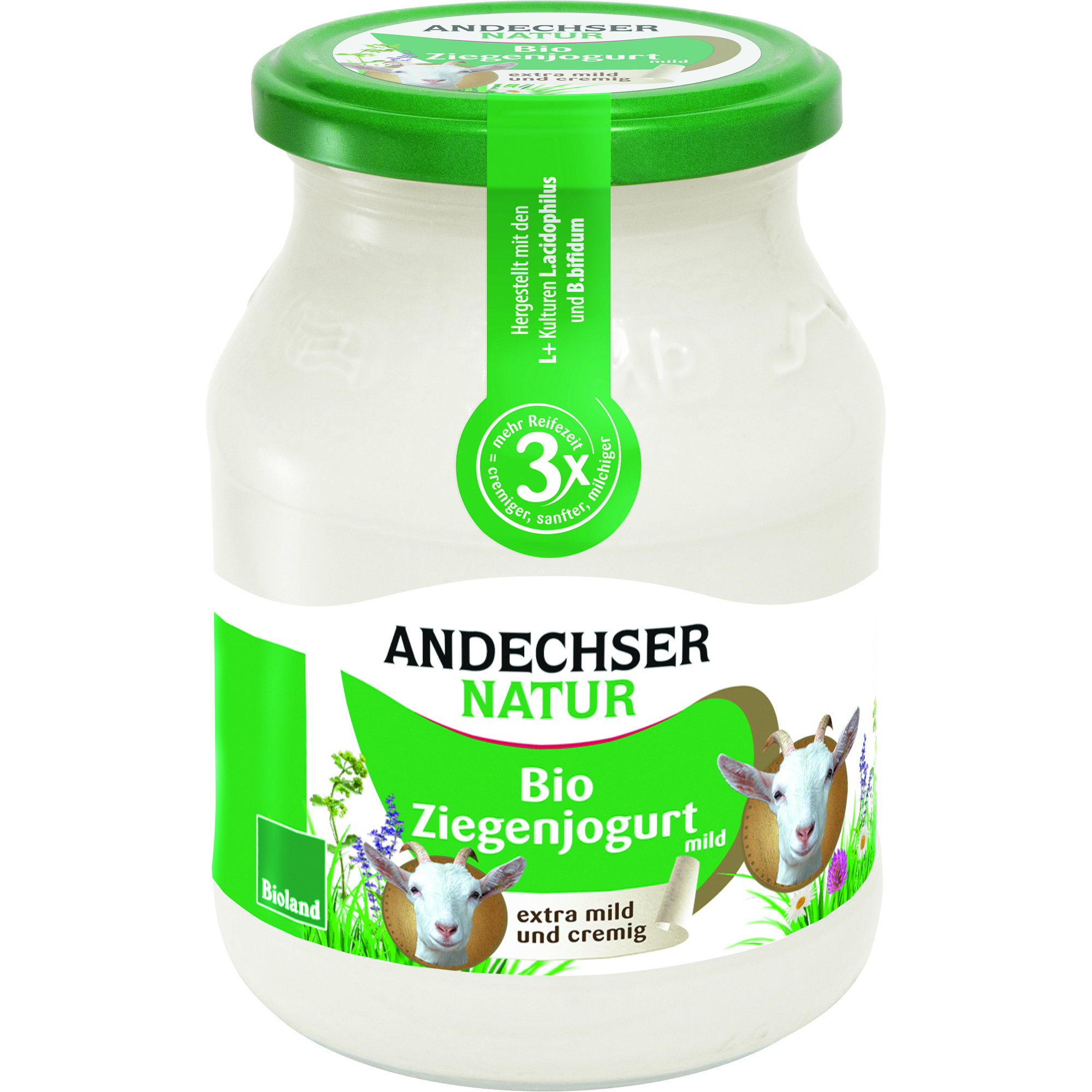 The ANDECHSER NATUR mild organic goat yogurt with 3.5% fat is extra mild and creamy. Produced from 100% goat milk in prime Bioland quality. Available in a 500g returnable jar.