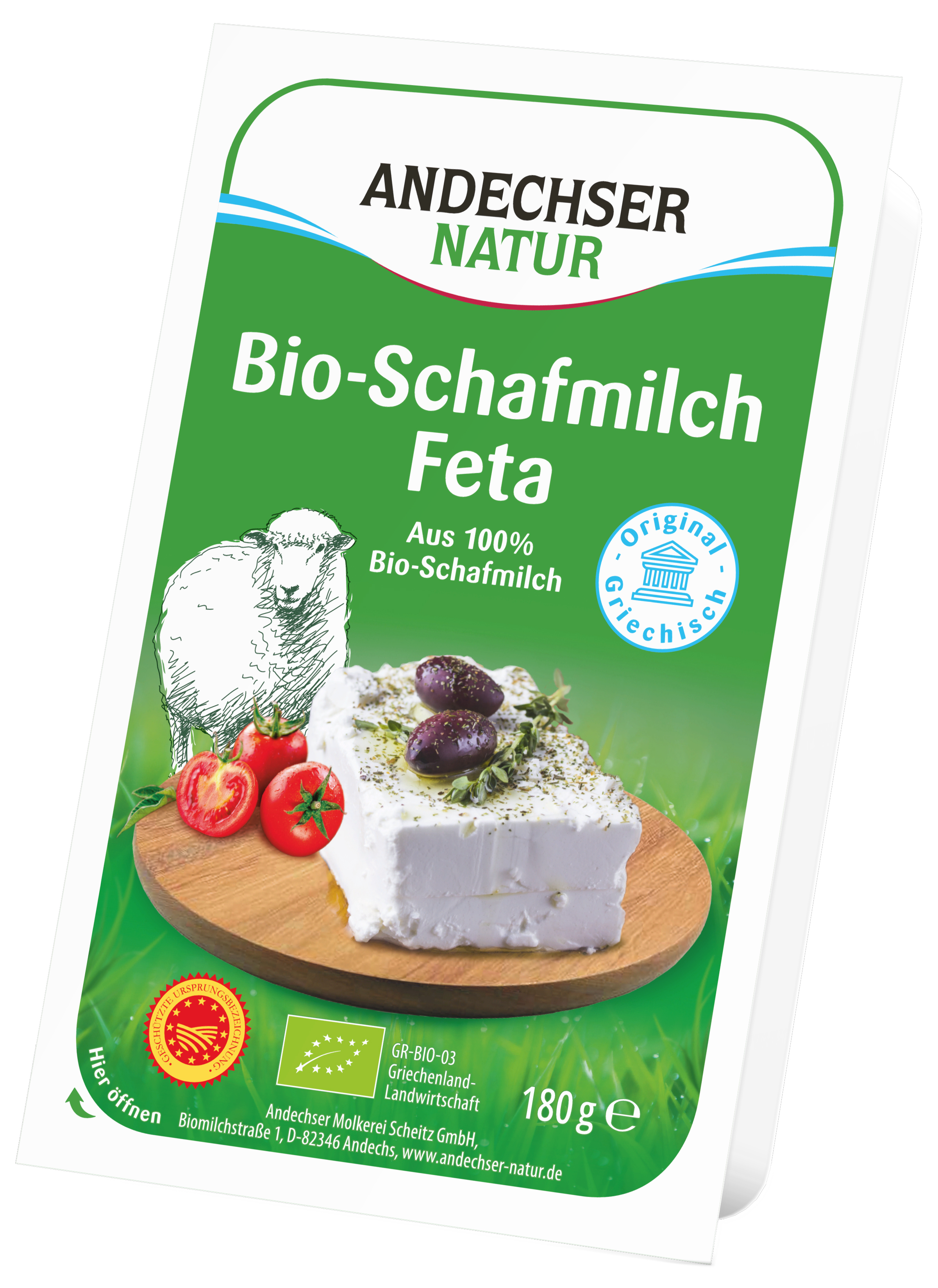 The ANDECHSER NATUR organic feta cheese, 180g with 45% fat is the Greek specialty made with protected designation, of 100% organic sheep milk. With its balanced, savory flavor it is the perfect companion for Mediterranean barbecue dishes.