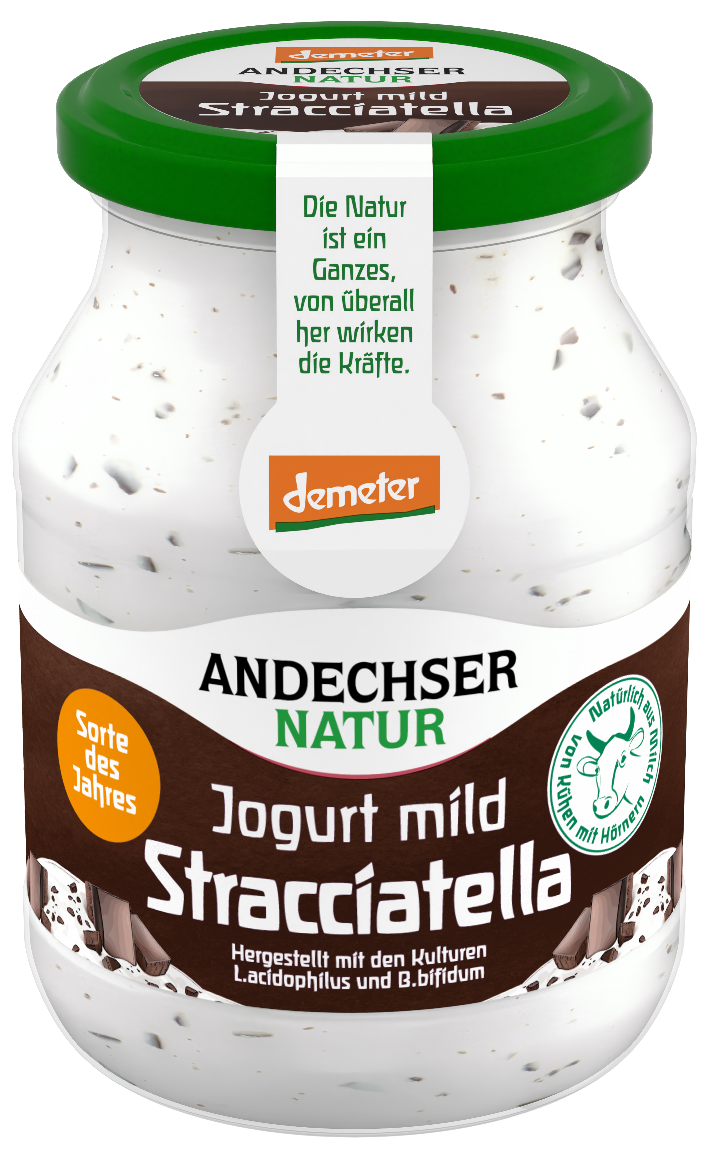 Our ANDECHSER NATUR demeter yoghurt mild stracciatella with 3.8% fat combines creamy yoghurt with crunchy chocolate chunks.